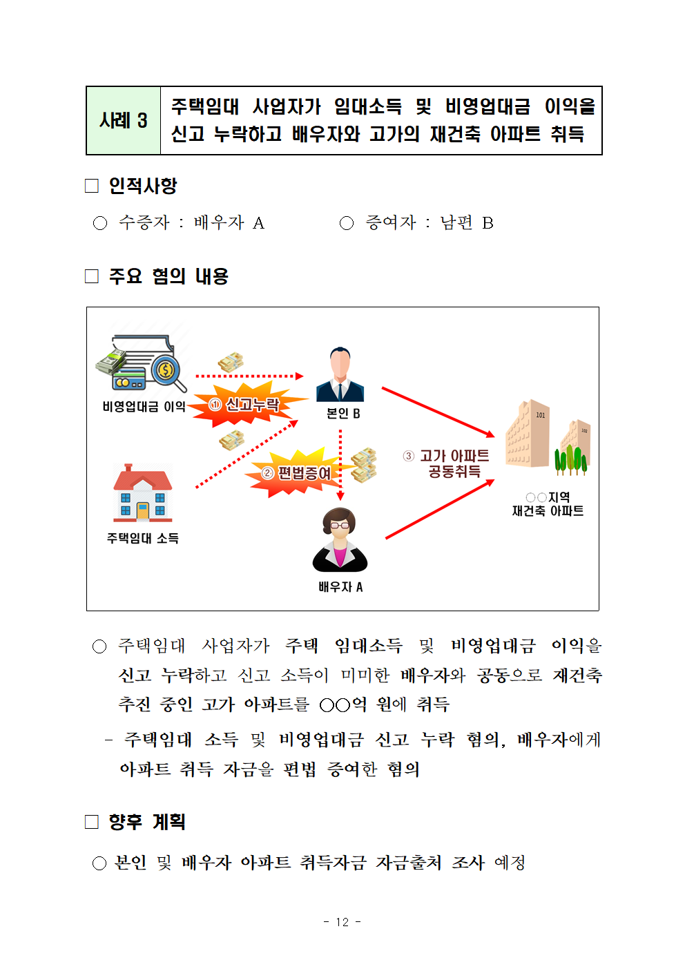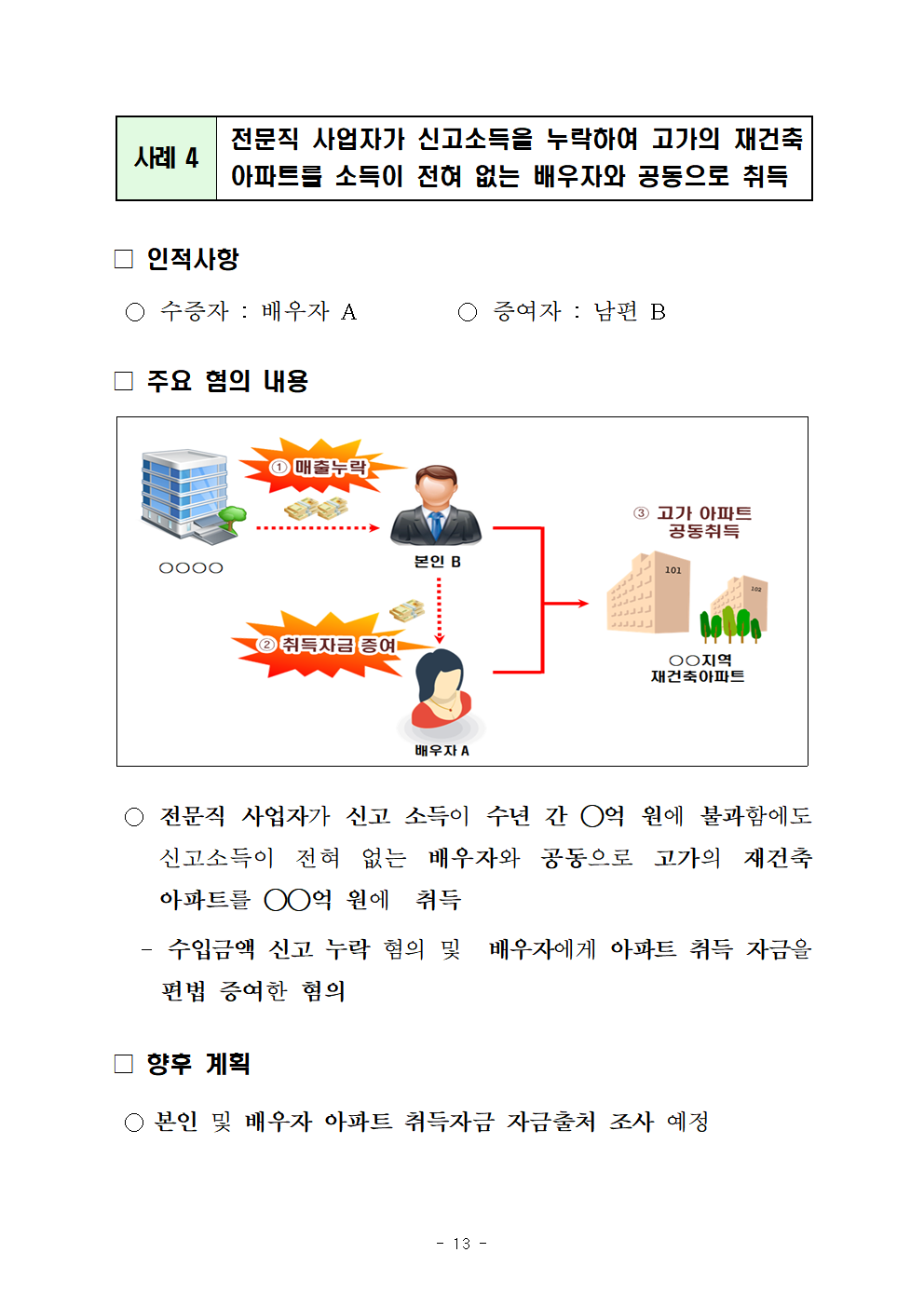 ◇전문직 사업자가 신고 소득금액이 수년간 ○억 원에 불과함에도 재건축 추진 중인 고가 아파트를 소득이 전혀 없는 배우자와 ○○억 원에 공동으로 취득