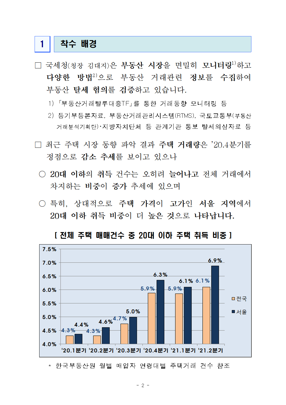 □(착수 배경)국세청은 부동산 시장을 면밀히 모니터링하고 다양한 거래 정보를 수집하여 탈세혐의를 검증하고 있습니다.