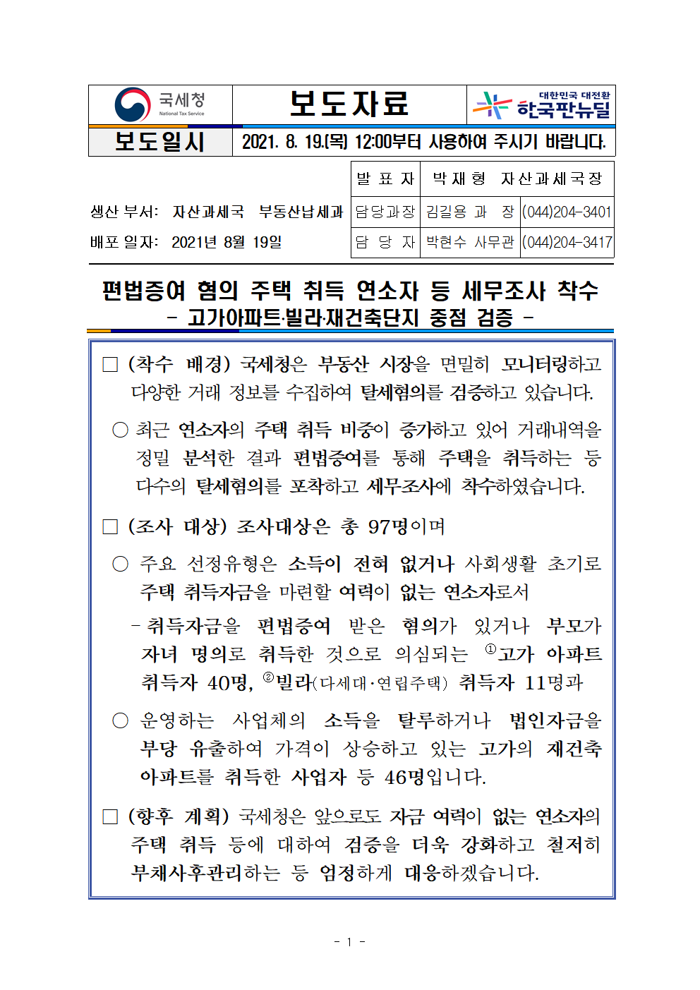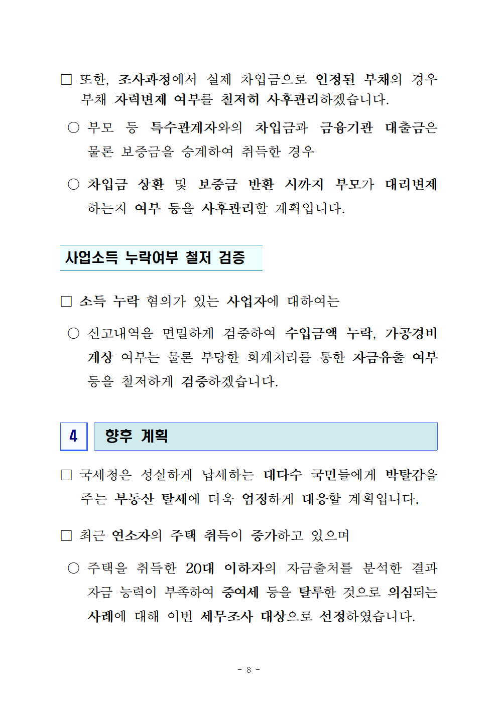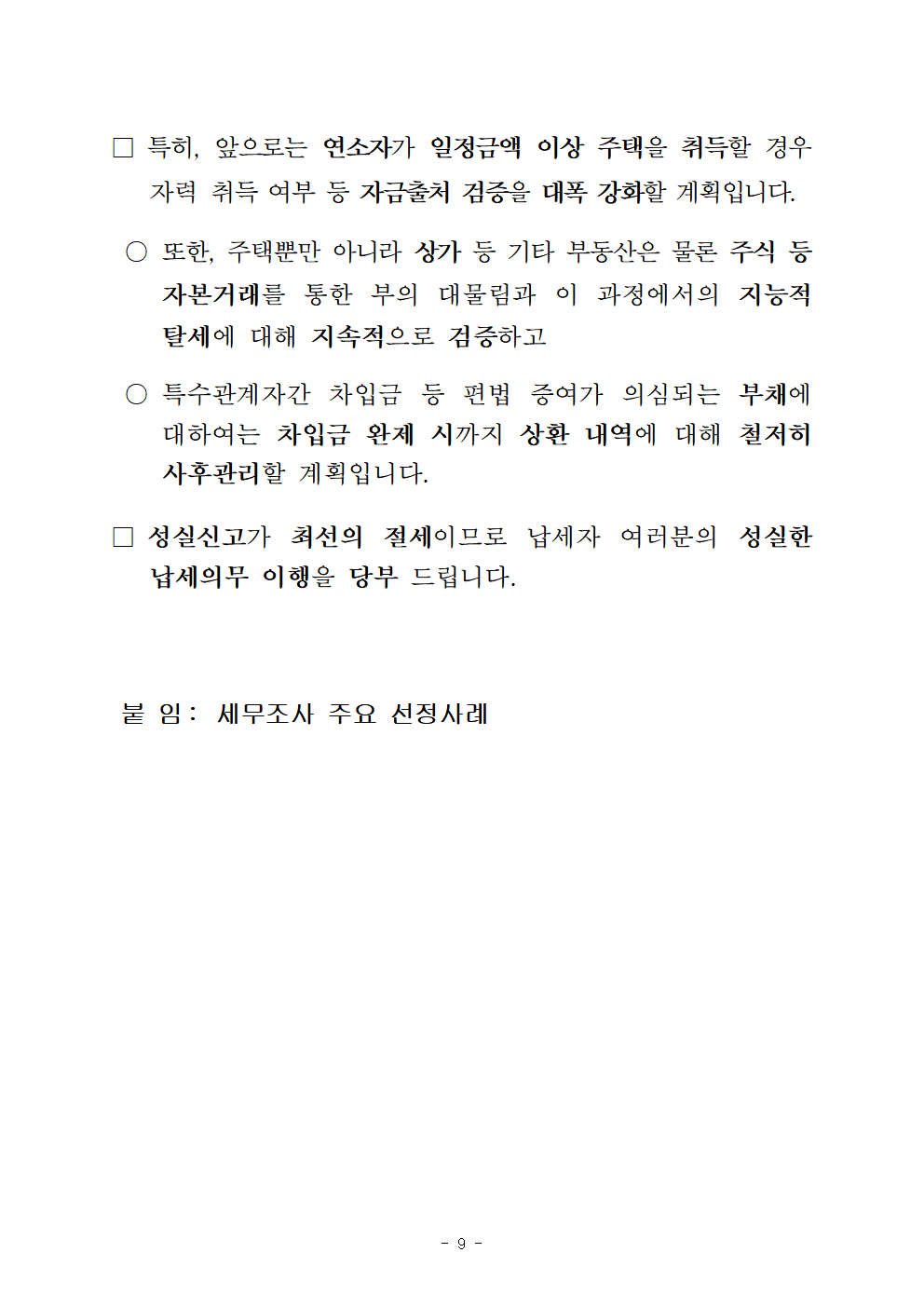 □국세청은 성실하게 납세하는 대다수 국민들에게 박탈감을 주는 부동산 탈세에 더욱 엄정하게 대응할 계획입니다.
