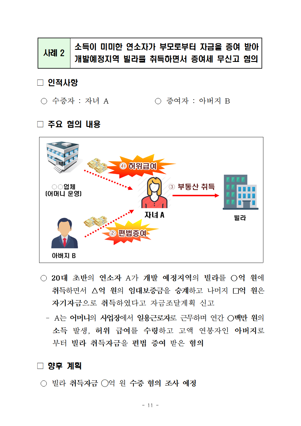 -A는 어머니의 사업장에서 일용근로자로 근무하며 연간 ○백만 원의 소득 발생, 허위 급여를 수령하고 고액 연봉자인 아버지로부터 빌라 취득자금을 편법 증여 받은 혐의
