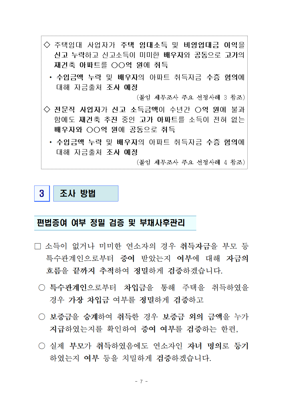 □(향후 계획)국세청은 앞으로도 자금 여력이 없는 연소자의 주택 취득 등에 대하여 검증을 더욱 강화하고 철저히 부채사후관리하는 등 엄정하게 대응하겠습니다.
