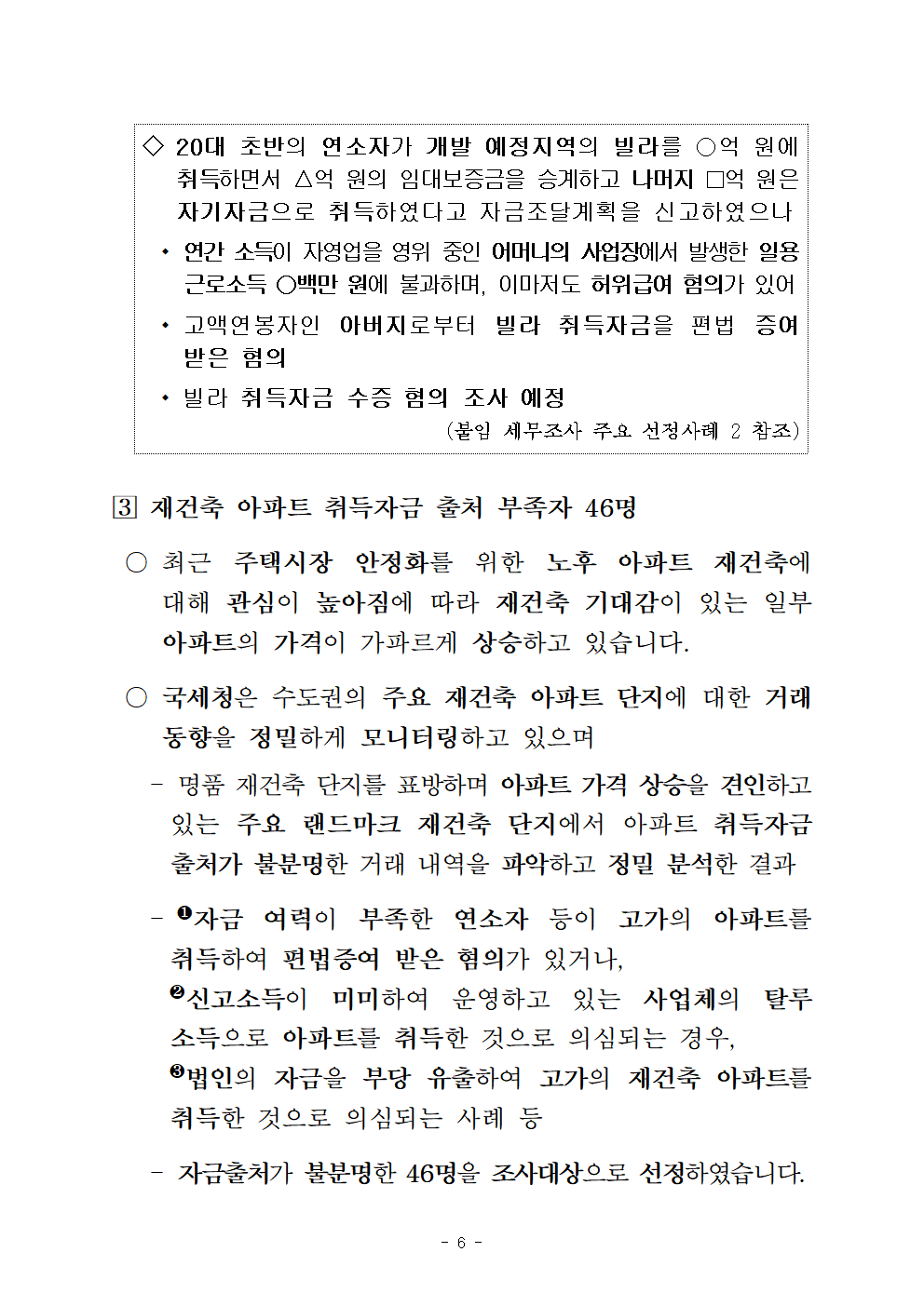 ○운영하는 사업체의 소득을 탈루하거나 법인자금을 부당 유출하여 가격이 상승하고 있는 고가의 재건축아파트를 취득한 사업자 등 46명입니다.