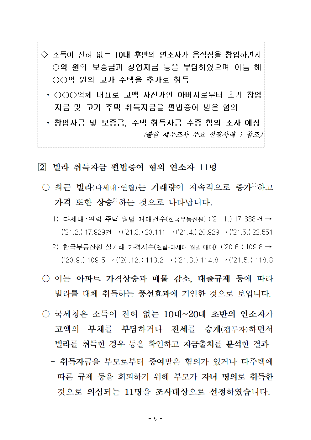 -취득자금을 편법증여 받은 혐의가 있거나 부모가 자녀 명의로 취득한 것으로 의심되는 ①고가 아파트 취득자 40명, ②빌라(다세대・연립주택) 취득자 11명과