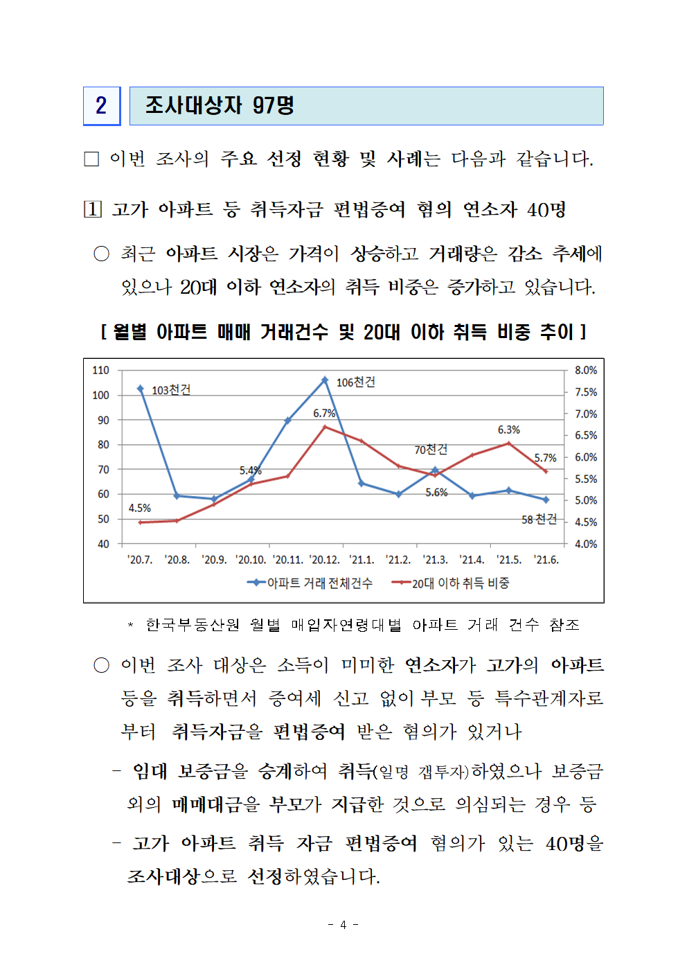 -고가 아파트 취득 자금 편법증여 혐의가 있는 40명을 조사대상으로 선정하였습니다.